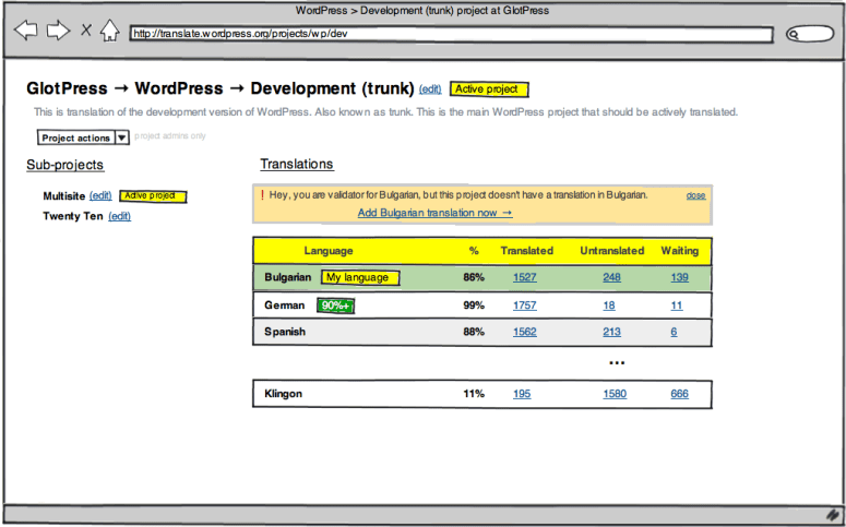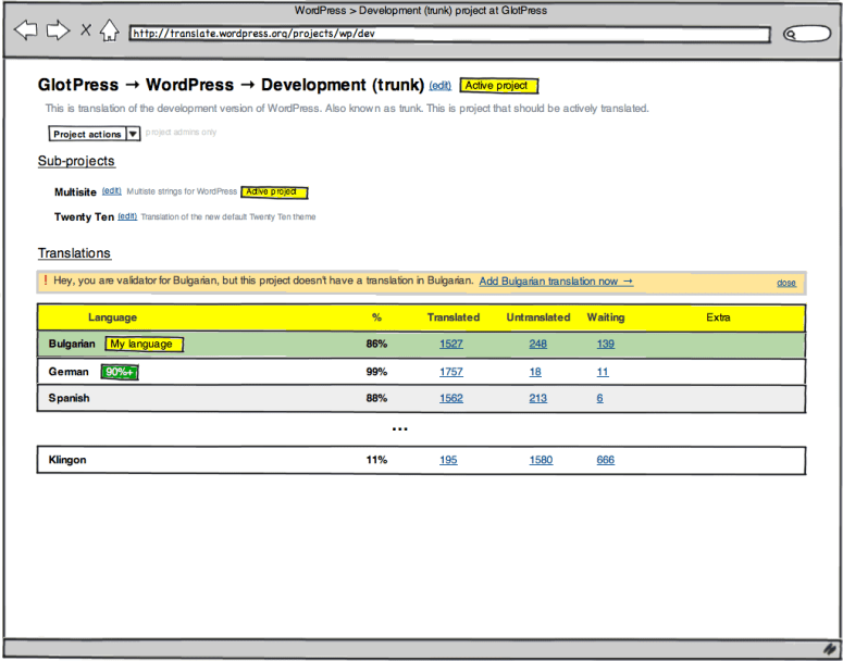 The projects page, listing all sub-projects and translations, is one of the most visited pages in GlotPress. But its current layout lacks vital information. Like which translation teams have reaches furthest in the translation race. Or where should I start translating, if I am not an active translator. That’s why we have some mockups of the project page, redesigned.